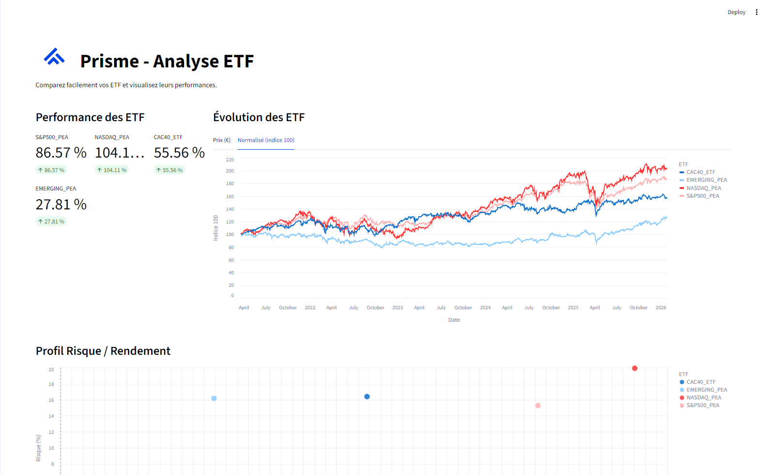 Mise en place d’un outil d’aide à la décision permettant de comparer les ETF, d’évaluer le risque et de proposer des allocations cohérentes selon différents profils investisseurs.